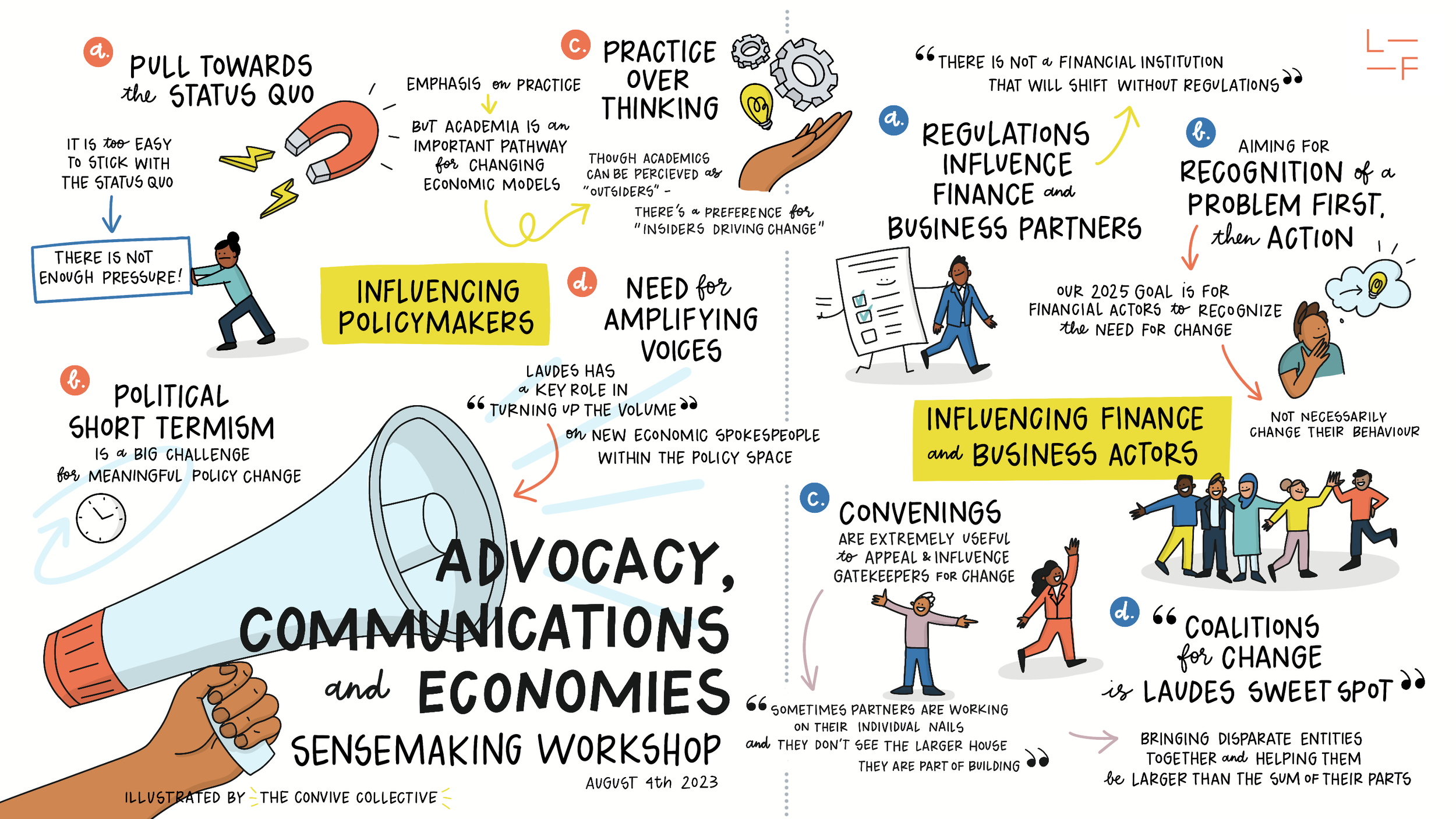 Through a combination of powerful learning experience design and visual storytelling techniques, we supported Laudes in better utilizing evidence in strategic discussions and decisions. This included visual facilitation at Foundation-wide sensemaking workshops, ‘so what’ strategic decision sessions, and an Evidence Day that elevated Laudes’s engagement with their grantmaking and systems change data for smarter, collective decisions.